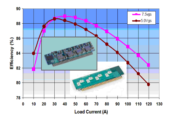 VRM線路板被重新設(shè)計(jì),用4Oz厚覆銅,進(jìn)一步減小PCB走線電阻,改善熱性能。圖2所示為這款4Oz厚覆銅板的VRM,在500KHz工作頻率,12V輸入電壓,1.7V輸出電壓,600LFM風(fēng)冷的條件下的效率曲線。在一個(gè)很寬的負(fù)載電流范圍內(nèi),7.5V柵驅(qū)動(dòng)電壓表現(xiàn)出更高的效率。此款VRM在最大負(fù)載電流120A時(shí),效率達(dá)到82%。