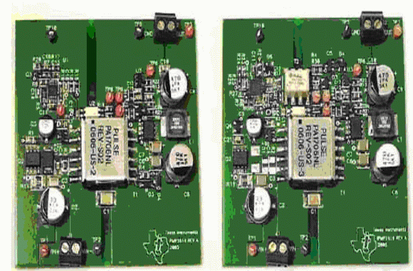 在高功率應用中,越來越多的人選用有源鉗位正向轉換器。然而,只有極少數電源設計人員能夠意識到他們同樣可以在反向轉換器中使用有源鉗位。為了找出在反向拓撲結構中采用有源鉗位控制的益處,我們根據表 1 中的規范設計、構建并測試了兩個電源。這兩個電源均使用次級同步整流,但是其中一個使用電源變壓器來驅動同步 FET,另一個則使用一個柵極驅動變壓器并且還采用了一個有源鉗位。POE 輸入要求產生了許多規范,但是我們可以擴大其輸入范圍以實現在電信領域的應用。為了公平比較起見,我們使主要組件不受該兩種設計中使用兩種完全一致的方法所產生的不同差異的影響,圖 1 給出了每個電路的圖片。我們還需使兩個電路板中組件的安放位置和布局一樣。在這兩個電路中,最值得注意的不同點是有源鉗位電路中柵極驅動變壓器的添加。