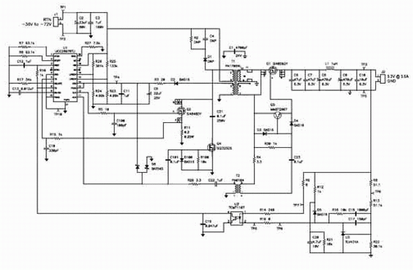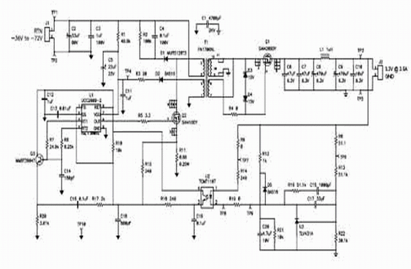 圖 3 顯示了傳統同步反向電源設計的完整原理圖。該設計使用了一個低成本、簡化的電流模式 PWM 控制器(即 UCC2809),對電源進行控制。除了主緩沖器以外,該電路還需要D3 和 D4 的齊納鉗位電路,以防止來自漏極電感峰值的 Q1 超高柵-源電壓。