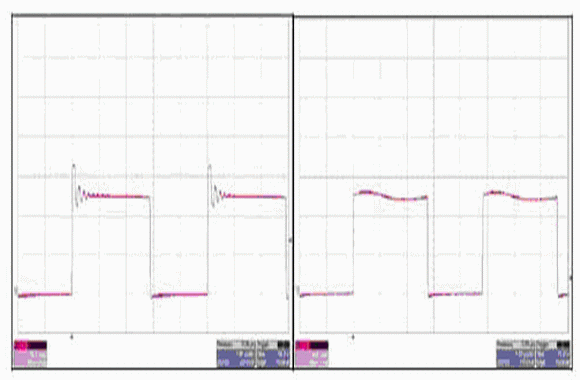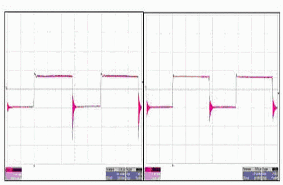 如圖 6 所示,您可以通過變壓器二次級電壓對這兩種設計進行更多的區分。表面看來,這兩個波形極為相似。進一步檢查的話,您就會發現傳統同步反向電源的負振鈴要比有源鉗位反向電源的負振鈴嚴重很多。該振鈴是由同步 FET 關閉延遲引起的,通常出現在主 FET 轉換開啟的時候。請注意,同步 FET 的柵-源關閉電壓與反向次級繞組電壓相同。在變壓器次級電壓變為負值的同時,同步 FET 必須完全關閉(實現這一操作比較困難),否則就會出現直通現象??刂破黩寗拥臇艠O驅動信號有源鉗位設計確保了同步 FET 在主 FET開啟之前被關閉,并減少了電壓振鈴。這也影響了對同步 FET 的選擇。與傳統的同步反向電源相比較,有源鉗位設計可以使用一個帶有更低 Rdson 的緩同步 FET。由于 FET 主體二極管的反向恢復,有源鉗位的同步 FET 上仍然會出現少許振鈴現象。