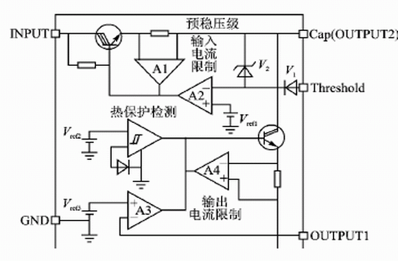 從圖1中還可以看出,VB409還有輸入、輸出電流的限制和熱保護功能。其作用在于:一方面當輸出短路時限制電流的輸出;另一方面當過載時關斷芯片。