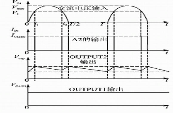VB409采取的是導通角技術,即在交流電的一個周期中,根據負載的電流大小,自動調整每個周期的導通時間。也就是說,只在每個正周期的低壓部分,從電源吸收電能,因此極大地降低了功耗,電流輸出能力是線性電源的3倍。其工作波形如圖2所示。