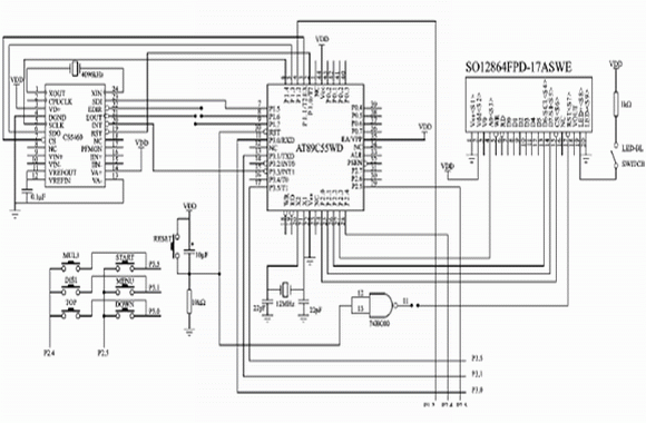 圖4為筆者設計的一個典型應用系統的原理圖。圖4為測量電能并在LCD上顯示的MCU應用系統。CPU采用AT89C55WD,最大耗電量為20 mA(若采用STC89C58RD+,則耗電量可降至9 mA左右);LCD選用SO12864,采用COG式,連同背光最大耗電為20mA;功率/電能計量芯片CS5460的最大耗電量為5 mA,加上復位、鍵盤等最大耗電量小于50 mA;繼電器輸出沒有畫出,耗電量為12mA。因此,完全可以使用VB409供電,且系統體積小,完全可以放置在LCD背后。