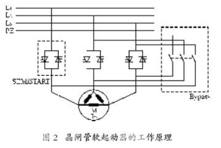 為了控制起動階段施加在感應電機上的電壓,需要一個軟起動裝置(軟起動器)。在軟起動器中,半導體(晶閘管)被用于電壓的控制。其工作原理如圖2所示。
