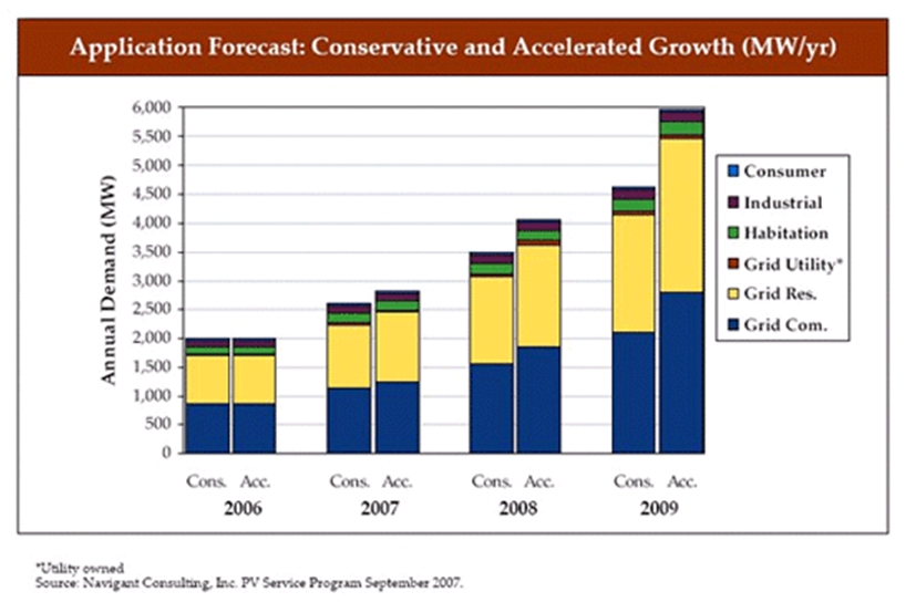 隨著全球能源需求的增長,大型和超大型并網光伏電站系統的建設已經在全球如火如荼地展開,它們發出的電能直接并入高壓輸電網絡,并可參與電力的輸送和調配,因此,是世界各國未來太陽能發電的重要發展方向。圖2所示為Navigant Consulting對未來幾年全球光伏市場發展趨勢的預測,其中可見,并網發電系統的增長最快。