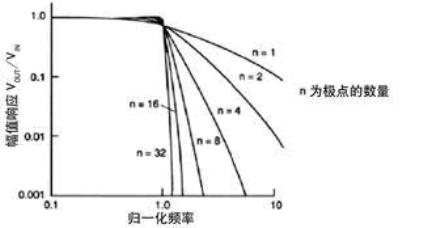 圖1  幾個低通濾波器的幅值響應與歸一化頻率的關系曲線。如果濾波器傳遞函數有多個極點(或階數),則頻率越高,衰減越快。