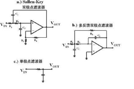 圖4  Sallen-Key (a)和多反饋 (b)濾波器都是2階,都有2個極點。單極點濾波器(c)是1階濾波器。這些模塊可以級聯,以生成高階濾波器。