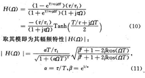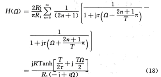 上式說明,Ie(Ω)是輸入電流頻譜I(Ω)周期延拓的組合,周期為Ω0=2π/T。各電流分量流過RC并聯支路時的電壓為相應電流分量與RC支路阻抗(R/(1+jωτ),ω=Ω±(2n+1)π/T)的乘積,于是輸出電壓頻譜U(Ω)為: