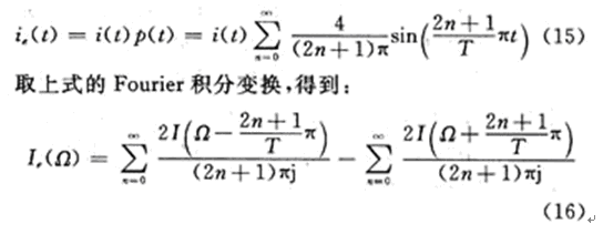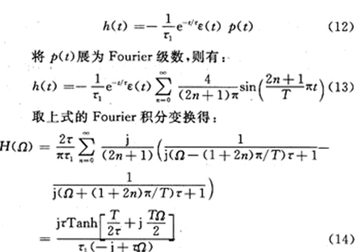 特別注意,求和式是一周期為2T的周期方波p(t)與單位階躍信號ε(t)的乘積,對上式取Fourier積分變換即得到開關電容電路系統頻譜函數(用j表示虛數單位,下同):