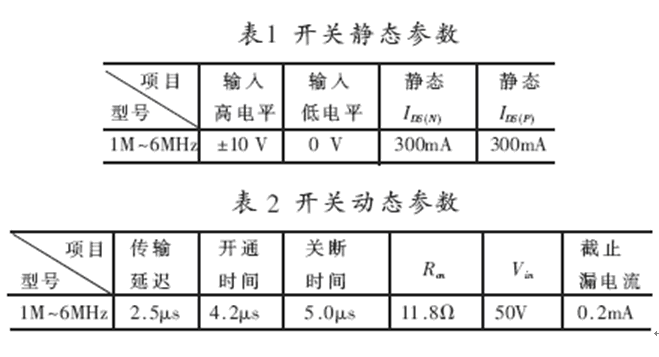 表1、2給出了開關(guān)的實測指標(biāo)。圖8給出了開關(guān)瞬時通斷仿真曲線。