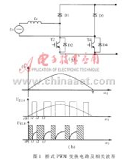 圖1(a)所示為工作在PWM整流狀態(tài)的H型橋式PWM變換電路(此圖為正弦波正半波輸入下的等效電路,上半橋的兩只IGBT未畫出),圖1(b)為下半橋兩只大功率器件的驅(qū)動信號和相關(guān)的器件波形。現(xiàn)以正半波工作過程為例進行分析(對于三相PWM電路,在整流、逆變工作狀態(tài)或單相DC/DC工作狀態(tài)下,PWM電路的分析過程及結(jié)論基本類似)。