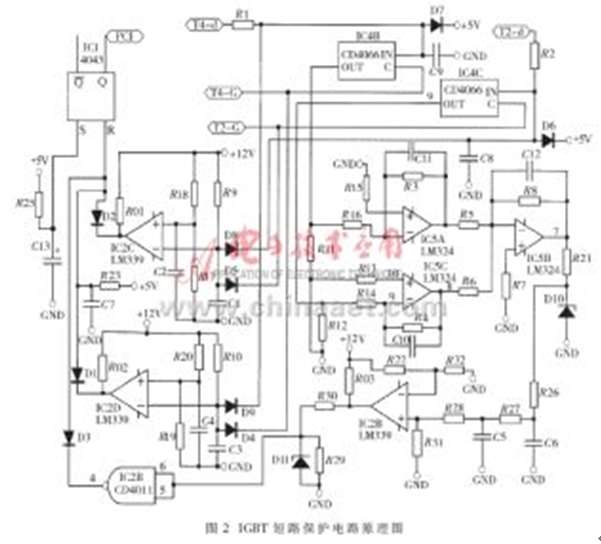 由對圖1所示電路的分析,可以得到IGBT短路保護電路的原理電路圖,如圖2所示。在圖2所示電路中, IC4及其外圍器件構(gòu)成選通邏輯電路,由IC5及其外圍器件構(gòu)成濾波及放大電路,IC2及其外圍器件構(gòu)成門限比較電路,IC1及其外圍器件構(gòu)成保持電路。正常情況下,D1、D2、D3的陰極所連接的IC2D、IC2C及CD4011的輸出均為高電平,IC1的輸出狀態(tài)不會改變。假設(shè)由于某種原因,在給T2發(fā)驅(qū)動信號的時候,H型橋式PWM變換電路的左半橋下管T2的管壓降異常升高(設(shè)電平值為“高”),即T2-d端電壓異常升高,則該高電平UT2-d通過R2加在D8的陰極;同時,發(fā)給T2的高電平驅(qū)動信號也加在二極管D5的陰極。對IC2C來說,其反相輸入端為高電平,若該電平值大于同相輸入端的門檻電平值的話,則IC2C輸出為“低”。該“低”電平通過D2加在R-S觸發(fā)器IC1的R輸入端,使其輸出端Q的輸出電平翻轉(zhuǎn),向控制系統(tǒng)發(fā)出IGBT故障報警信號。如果是由于右半橋下管T4的管壓降異常升高而引起IC2D輸出為“低”,則該“低”電平通過D1加在R-S觸發(fā)器IC1的R輸入端,使其輸出端Q的輸出電平翻轉(zhuǎn),向控制系統(tǒng)發(fā)出IGBT故障報警信號。由IC5A和IC5C及其外圍器件構(gòu)成的濾波及放大電路將選通電路送來的描述IGBT管壓降的電壓信號進行預處理后,送給由IC5B構(gòu)成的加法器進行運算處理。若加法器的輸出電平大于由R22和R32確定的門檻電平,則會使R-S觸發(fā)器IC1的R端的第三個輸入端為“低”,也向控制系統(tǒng)發(fā)出IGBT故障報警信號。改變由R22和R32確定的門檻電平,就可以靈活地改變這第三路報警信號所代表的物理意義,從而靈活地設(shè)計保護電路。圖2中的端子T4-d、T2-d,分別接在T4、T2的集電極上,T4-G、T2-G分別接IGBT器件T4、T2的驅(qū)動信號。在電路設(shè)計時應(yīng)該特別注意的是,D8、D5、D9、D4必須采用快速恢復二極管。