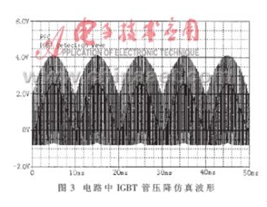 當圖1所示的PWM變換器工作在單相高頻整流模式下,應(yīng)用PSPICE仿真軟件對圖2所示的電路進行仿真研究,可以得到如圖3所示的結(jié)果。圖3所示的仿真波形相當于在圖2電路中IC5B的第7腳觀察到的信號波形。仿真結(jié)果表明,檢測電路可以快速、有效地將PWM變換器的下管導通時的管壓降檢測出來。圖4所示波形是實際電路工作時檢測到的相關(guān)波形。圖中,1#通道顯示的是單相高頻整流電感電流的給定波形,2#通道顯示的是實際檢測到的圖2電路中IC5B的第7腳的工作波形。比較圖3和圖4可以得出,該檢測電路可以快速、有效地檢測出IGBT導通時的管壓降,從而對IGBT實施有效的保護。