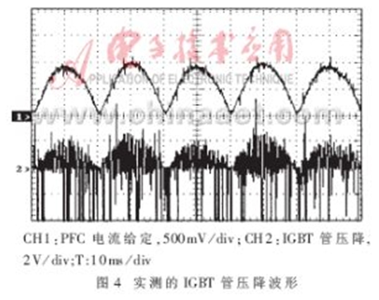 圖5所示為IGBT過流時實際檢測到的PFC電感中流過的電流及保護電路動作的波形。