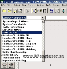 a.在圖1所示下拉菜單中選擇“Filter DG - ALL”,選擇我們需要的帶通組件 ,放入原理圖中。