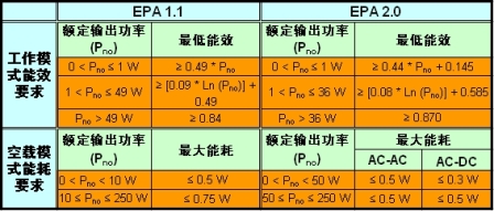 表1:美國環保署“能源之星”外部電源的1.1及2.0版規范。