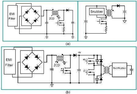 如前所述,一旦功率大于75 W,除了滿足上述工作能效及空載能耗要求外,電路中還面臨著加入PFC的要求,這在改善功率因數、使電網電能得到更高效利用的同時,也會使得電路結構更為復雜。在這類應用中,傳統電源架構是PFC+PWM的兩段式架構,即在非連續導電模式(DCM)或臨界導電模式(CrM)段后跟隨著準諧振反激段,每個段都使用一個控制器,如圖2(a)所示。