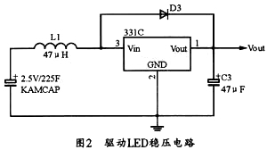 由于所選用的LED燈的額定電壓為3.3 V,而超級(jí)電容器的電壓為5.0 V,并且超級(jí)電容器在放電過(guò)程中電壓會(huì)不斷降低,因此需要有穩(wěn)壓電路來(lái)驅(qū)動(dòng)LED。