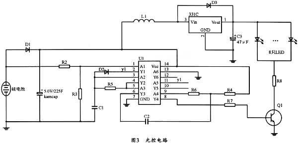 超級(jí)電容器太陽(yáng)能草坪燈需要光控開關(guān)電路來(lái)控制LED的開關(guān)。以便在周圍環(huán)境光線變暗時(shí)點(diǎn)亮LED,并當(dāng)光線變亮?xí)r關(guān)閉LED。有些光控開關(guān)電路采用光敏電阻來(lái)開關(guān)LED,也可以直接采用太陽(yáng)能電池做光敏開關(guān),因?yàn)樘?yáng)能電池特性比光敏電阻好。這部分電路如圖3所示。