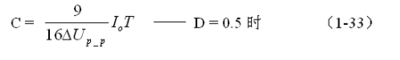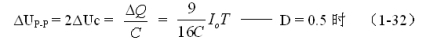 (1-33)和(1-34)式,就是計(jì)算反轉(zhuǎn)式串聯(lián)開關(guān)電源儲能濾波電容的公式(D = 0.5時)。式中:Io是流過負(fù)載電流的平均值,T為開關(guān)工作周期,ΔUP-P為濾波輸出電壓的波紋,或電壓紋波。一般波紋電壓都是取電壓增量的峰-峰值,因此,當(dāng)D = 0.5時,波紋電壓等于電容器充電的電壓增量,即:ΔUP-P = 2ΔUc 。