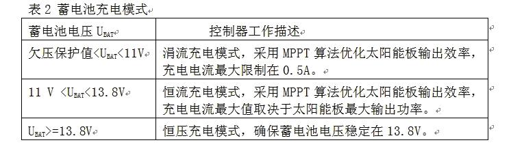 當(dāng)系統(tǒng)檢測(cè)到環(huán)境光充足,控制器就會(huì)進(jìn)入充電模式。蓄電池充電有兩個(gè)比較重要的電壓值:深度放電電壓和浮充充電電壓。前者代表在正常使用情況下蓄電池電能被用完的狀態(tài), 而后者則代表蓄電池充電的最高限制電壓,這些參數(shù)應(yīng)該從蓄電池產(chǎn)品手冊(cè)上可以查到。在設(shè)計(jì)電路中針對(duì)12V蓄電池,分別設(shè)置深度放電電壓為11V和浮充充電電壓為13.8V(皆為在室溫條件下的電壓值,軟件中這兩個(gè)值增加了相應(yīng)的溫度補(bǔ)償),具體充電模式如表2所示。