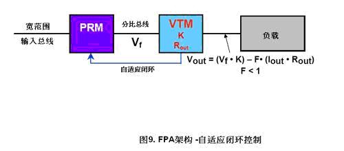 自適應閉環(圖9)。由VTM把訊號傳送給PRM,讓PRM調整分比母線。以補償VTM的輸出阻抗。自適應閉環只需要在VTM與PRM之間接上簡單、非隔離的反饋電路,它的穩壓精度便可達+/-1%。
