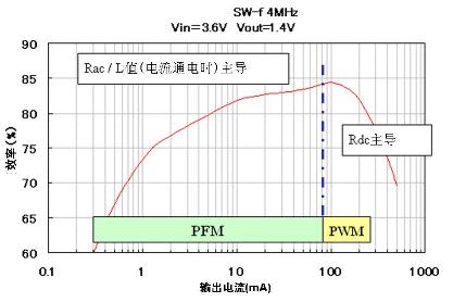 DC-DC轉換器的電源轉換效率和功率電感性能之間的關聯如圖3所示。PFM是指手機在待機狀態下保持低電流負荷的模式,這時電源轉換效率性能是與功率電感的Rac (交流電阻) 以及電流-感值偏執特性相關。圖4當中顯示了各功率電感的Rac特性以及圖5中開關頻率數是4MHz的DC-DC轉換器IC的電源轉換效率特性。