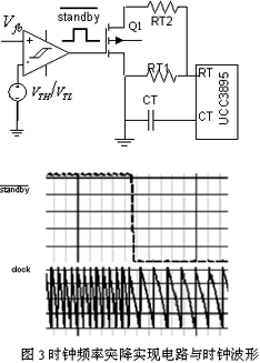 突降實現方法如圖3:以UCC3895為例,當電源處于正常負載狀態時,Q1導通,其時鐘周期為: