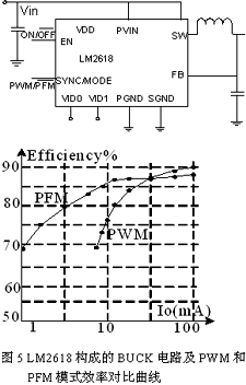對于額定功率時工作在PWM模式的開關電源,,也可以通過切換至PFM模式提高待機效率,即固定開通時間,調節關斷時間,負載越低,關斷時間越長,工作頻率也越低。圖5是采用NS公司的LM2618控制的Buck轉換器電路和分別采用PWM和PFM控制方法的效率比較曲線。由圖可見,在輕載時采用PFM模式的電源效率明顯大于采用PWM模式時的效率,且負載越低,PFM效率優勢越明顯。