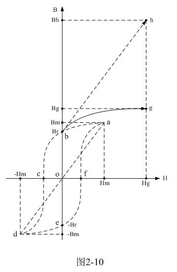 但當變壓器鐵芯中的磁化過程是從上次剩余磁通密度Br的位置開始時,上面所分析的理想磁化過程將要被破壞,磁通密度B不會再沿著理想磁化曲線d-a進行,而是沿著另一條新的等效磁化曲線進行;這條新的等效磁化曲線應該與原理想磁化曲線d-a平行,并且經過Br點,圖2-10中虛線b-h就是這條新的等效磁化曲線的一部分。這里只畫出新等效磁化曲線的一半,另一半在圖2-10中沒有畫出。