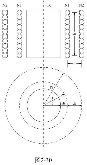在圖2-30中,N1、N2分別為變壓器的初、次級線圈,Tc是變壓器鐵芯。r是變壓器鐵芯的半徑,r1、r2分別是變壓器初、次級線圈的半徑;d1為初級線圈到鐵芯的距離,d2為初、次級線圈之間的距離。為了分析計算簡單,這里假設(shè)變壓器初、次級線圈的匝數(shù)以及線徑相等,流過線圈的電流全部集中在線徑的中心;因此,它們之間的距離全部是兩線圈之間的中心距離,如虛線所示。