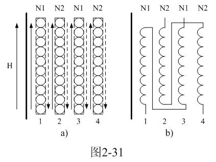 在圖2-31中,兩個線圈之間實線箭頭表示正磁通的方向,虛線表示反磁通的方向。從圖中可以看出,多層線圈間隙與間隙之間的正、反向磁通是可以部分抵消的,因此,變壓器線圈的漏感可以減小。