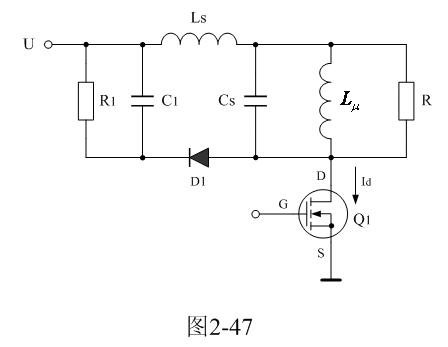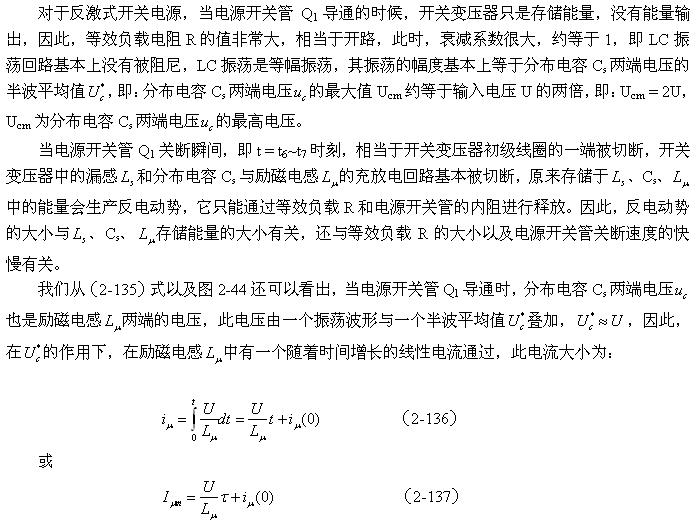 在圖2-46中,Cs1、Cs2都是分布電容,它們對于漏感 來說,既可以產(chǎn)生串聯(lián)振蕩,又可以產(chǎn)生并聯(lián)振蕩。在電源開關(guān)管Q1導(dǎo)通瞬間,漏感與分布電容主要是產(chǎn)生串聯(lián)振蕩,因?yàn)檩斎腚妷洪_始向串聯(lián)振蕩回路提供能量;在電源開關(guān)管Q1關(guān)斷瞬間,漏感與分布電容主要是產(chǎn)生并聯(lián)振蕩,因?yàn)槁└?必須要通過并聯(lián)回路釋放能量。在實(shí)際應(yīng)用中,漏感相對于勵(lì)磁電感 來說很小,因此如果不考慮漏感的作用,完全可以把Cs1、Cs2看成是一個(gè)分布電容。