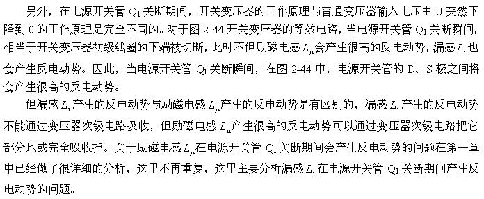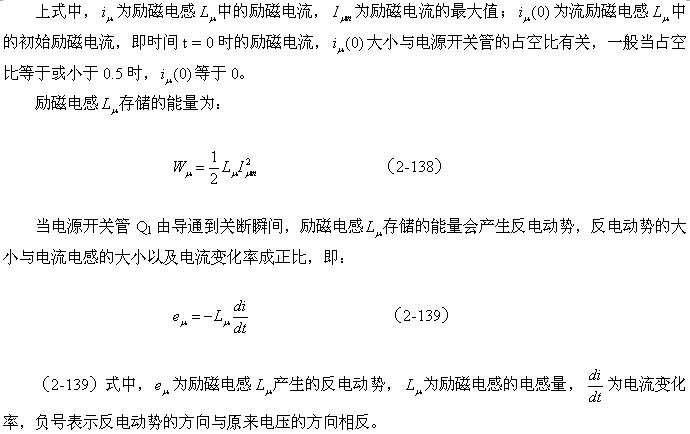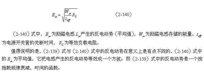 (2-140)式對于計(jì)算漏感 產(chǎn)生的反電動(dòng)勢或其它電感產(chǎn)生的反電動(dòng)勢同樣有效。漏感 中存儲(chǔ)的能量可根據(jù)(2-138)式求得;而流過漏感 的電流,對于反激式開關(guān)電源:可認(rèn)為與勵(lì)磁電流的大小基本相等,因?yàn)椋诜醇な介_關(guān)電源中,等效負(fù)載電阻等于無限大;對于正激式開關(guān)電源:可認(rèn)為與流過等效負(fù)載電阻的電流大小基本相等,因?yàn)椋谡な介_關(guān)電源中,勵(lì)磁電流相對于流過等效負(fù)載電阻的電流,很小。