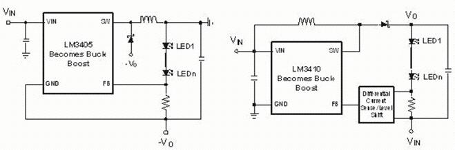 單電感Buck-boost可以像Buck或Boost調(diào)節(jié)器一樣組建,使它在系統(tǒng)成本的角度來講很吸引人。這種拓?fù)涞囊粋€(gè)缺點(diǎn)是Vo被反置(圖2a)或者以VIN為參照(圖2b)。測(cè)平移動(dòng)或者反偏電路必須要用一些轉(zhuǎn)換器。像boost轉(zhuǎn)換器,它們有一個(gè)不連續(xù)輸出電流,并且需要一個(gè)輸出電容來維持一個(gè)持續(xù)LED電流。功率MOSFET要承受一個(gè)峰值為IIN加上IF的電流還有一個(gè)峰值為VIN加上VO的電壓。