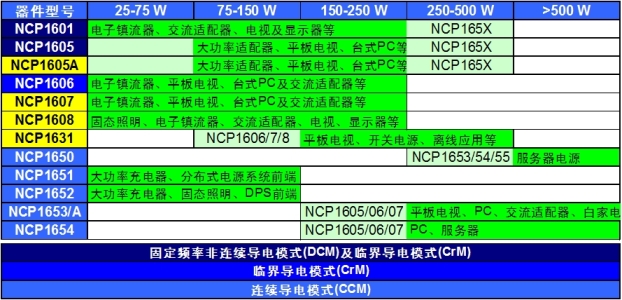 安森美半導體提供豐富PFC控制器選擇,如NCP1601/5/6/7/8、NCP1631、NCP1650/1/2/3/4等,涵蓋上述不同工作模式,優化用于不同功率的應用,見表1。如NCP1606/7/8采用CrM工作模式,適合于功率通常低于300W的中等功率應用,如電子鎮流器、液晶電視、等離子電視、臺式計算機和交流適配器等。最新推出的NCP1654均工作在CCM模式,適用于功率大于200W以上的場合。NCP1654的前身NCP1653推出幾年來已經獲得了極大的成功,廣泛應用于臺式計算機,開放式電源等領域。特別是在液晶電視和等離子電視中更是占據了絕大多數的市場份額。