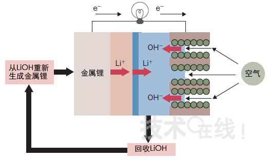 在該電池中,由放電反應生成的并非是固體的Li2O,而是容易溶解在水性電解液中的LiOH(氫氧化鋰)。因此,氧化鋰在空氣電極堆積后,不會導致工作停止。另外,水及氮等也不會穿過固體電解質的隔壁,因此不存在與負極的鋰金屬發生反應的危險。而且,在充電時,如果配置充電專用的正極,還可防止充導電致空氣電極的腐蝕和老化。
