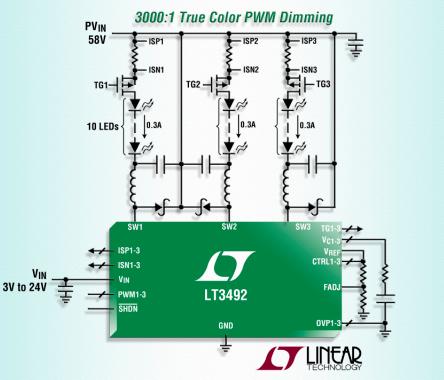 凌力爾特公司 (Linear Technology Corporation) 推出 2.1MHz DC/DC 轉換器 LT3492,該器件為作為 3 通道恒定電流 LED 驅動器工作而設計。LT3492 的 3 個通道中每一個都可以驅動多達 10 個 300mA 的串聯 LED,從而使它能夠以高達 96% 的效率驅動多達 30 個 300mA LED。所有 3 個通道都由一個獨立的 True Color PWM™ 信號控制,從而使每個通道都能獨立調光至高達 3000:1 的調光比。固定頻率、電流模式架構確保在寬的電源和輸出電壓范圍內穩定工作。頻率調節引腳使用戶能夠在 330kHz 至 2.1MHz 范圍內設定頻率,以優化效率,同時最大限度地減小外部組件尺寸。LT3492 的耐熱增強型 4mm x 5mm QFN (或耐熱增強型 TSSOP) 封裝為高達 50W LED 應用提供一個占板面積高度緊湊的解決方案。