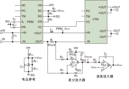 上述電路由電壓參考、分流電阻、差分放大器和誤差放大器組成。低端檢測電路是在PRM輸出端用配置為差分放大器的一個運放實現的。分流電阻(R1)上的電壓經檢測并被放大電阻R2到R5確定的增益倍數。參考電壓使用精確可調的分流參考產生,并連接到誤差放大器的同相端子。這是誤差放大器用以與差分放大器輸出(VSENSE)比較的電壓。誤差放大器的輸出(VEAO)經過電阻R7和R8連接到SC,從而實現PRM輸出設置點的調整。誤差放大器將調整PRM輸出電壓,直到VSENSE等于參考電壓VREF。這將迫使VTM輸入電流以及VTM輸出電流成為由VREF確定的常數。