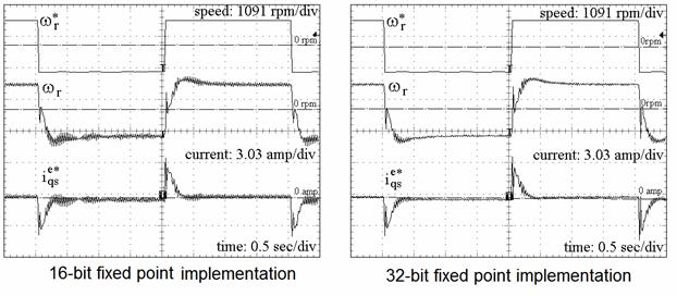 比例積分控制器的積分項總是采用 32 位字長甚至是 16 位定點版本,根據以往的經驗,采用 16 位積分累加的結果明顯地差的多。采用類似仿真的策略將 ±0.5 pu 的步長應用于系統速度參考。d 軸及 q 軸電流和估測速度作為速度命令的步長,這些也證實了仿真結果。在瞬態及穩態狀態下,仿真結果的響應相關性很強。不良振蕩瞬態及因采用 16 位實施造成的瞬態時間增加等情況下的量化效應是可以驗證的。