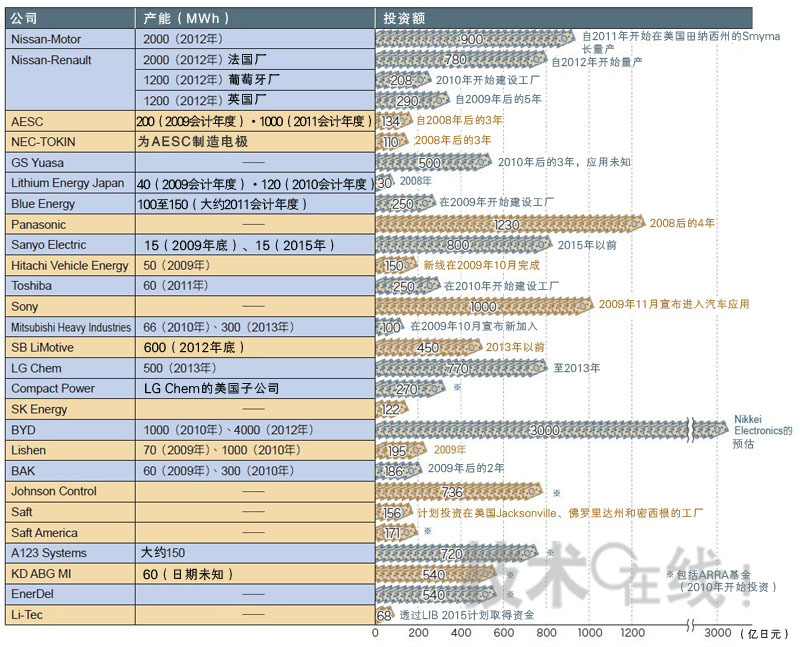 日本以外的電池制造商也很活躍。例如在韓國(guó)的樂(lè)金化學(xué)公司(LGChem)正投資大約1,000億日元,其中包括投資它的美國(guó)子公司;而SamsungSDI公司則是在2015年以前投資大約385億日元(注2)。在中國(guó)大陸,比亞迪公司(BYD)和天津力神電池公司,兩家公司都計(jì)劃將生產(chǎn)容量提升至1000MWh,中國(guó)近期的投資金額至少有2,000億日元。