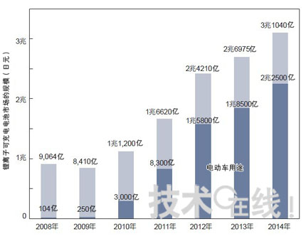 5年內(nèi)成長(zhǎng)90倍——鋰離子充電電池市場(chǎng)正處于大轉(zhuǎn)型期。在被電動(dòng)車(EV)采用后,預(yù)期鋰離子充電電池市場(chǎng)在未來(lái)5年內(nèi)將超越3萬(wàn)億日元。技術(shù)發(fā)展的激烈競(jìng)爭(zhēng)已展開(kāi),一系列新加入公司使得情況更為熱鬧。