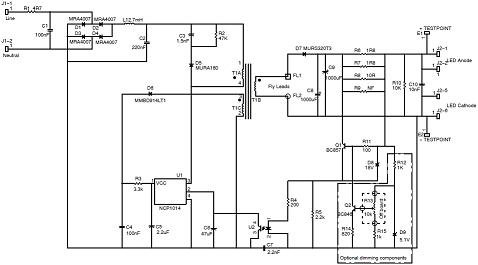 安森美半導體的NCP1014LEDGTGEVB評估板經過了優化,可以驅動1到8顆大功率高亮度LED,如CreeRebel、SeoulSemiconductorZ−Power®或OSRAMGolden?XR−E/XP−E、Luxeon™?XLAMP®Dragon™。這設計基于集成了帶內部限流功能的高壓電源開關的緊湊型固定頻率脈寬調制(PWM)轉換器NCP1014構建。由于NCP1014采用固定頻率工作,電流不能上升到高于某個特定點;這個點由輸入電壓及開關周期或導通時間結束前的初級電感來確定。由于導通時間的限制,輸入電流將跟隨輸入電壓的波形,從而提供更高的功率因數。相關電路圖見圖2。