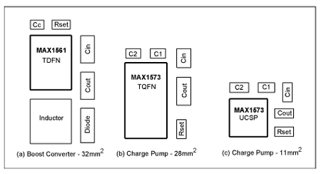圖3.因為要使用電感,升壓轉換器(a)比電荷泵(b)占用更大的電路板空間和高度。如果使用晶片級封裝的MAX1573和0402封裝的1μF電容,整個電荷泵方案(c)的尺寸就會非常小。