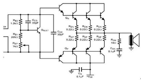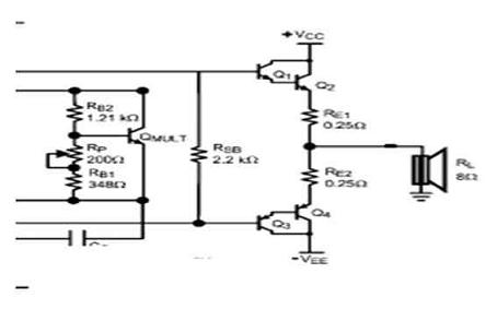 改善交越失真的最有效方法便是減少RE的電阻。對于相同數值的RE,一個平行形式的輸出可降低用來改善線性度的整體RE電阻值。同時,假如每一個級的RE都較大,那便可為輸出晶體管帶來更佳的匹配性和電流平衡。此外,RE也關系到輸出的功率損耗。對于一個相同的RE,較大的輸出電流會導致較大的功率損耗。RE的值取決于并聯輸出晶體管的數量和揚聲器的負載。建議采用足夠功率的0.1到0.5Ω電阻器。