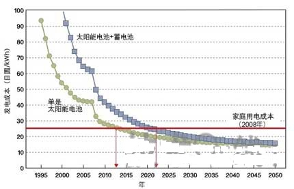 如同人們經(jīng)常指出的,太陽(yáng)能發(fā)電確實(shí)也有缺點(diǎn):下雨時(shí)輸出會(huì)很低,在陰天及其他情況時(shí)會(huì)有大幅波動(dòng),而且在夜晚時(shí)為零。然而,透過使用蓄電池后可以克服大部分的問題。如果配有蓄電池的太陽(yáng)能發(fā)電系統(tǒng)達(dá)到與市電同價(jià)后,將會(huì)有很大的沖擊(其中包括減少石化燃料消耗)。日本經(jīng)濟(jì)產(chǎn)業(yè)研究所(RIETI)已預(yù)估大約2022年,配有蓄電池的家用太陽(yáng)能發(fā)電系統(tǒng)將達(dá)到與市電同價(jià)(圖10)。