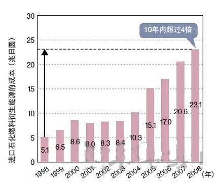 圖中顯示日本進(jìn)口的化石燃料衍生能源。圖由是AIST的櫻井和環(huán)境部依據(jù)金融貿(mào)易統(tǒng)計(jì)而制。