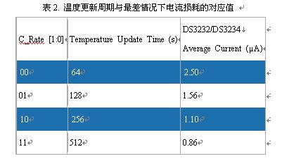 表2列出了DS3232/DS3234溫度更新周期與最差情況下電流損耗的對應值。計算中假設電池電壓為3.63V,I²C兼容接口不工作。C_Rate位上電時默認為0,對應于64s的溫度更新周期。