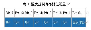 DS3234加入了溫度控制寄存器,當器件由備用電源供電時可以禁止溫度更新。寄存器中的BB_TD位控制溫度測量禁止。該位上電時的默認值為0,溫度更新功能有效。寄存器定義如表3所示。