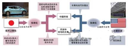 圍繞充電基礎(chǔ)設(shè)施的主導(dǎo)權(quán)之爭(zhēng),不僅是企業(yè)之間,而且是國(guó)與國(guó)、地區(qū)與地區(qū)之間的較量。競(jìng)爭(zhēng)的舞臺(tái)就是把車輛與住宅、車輛與電網(wǎng)之間交換的電力信息及電力的規(guī)格進(jìn)行標(biāo)準(zhǔn)化。隨著充電基礎(chǔ)設(shè)施的發(fā)展,汽車及住宅都有可能變成“通信終端”,那么這些終端之間的通信標(biāo)準(zhǔn)化就不可或缺。所以,為了形成有利于本國(guó)企業(yè)的規(guī)格,各國(guó)都開始競(jìng)爭(zhēng)。